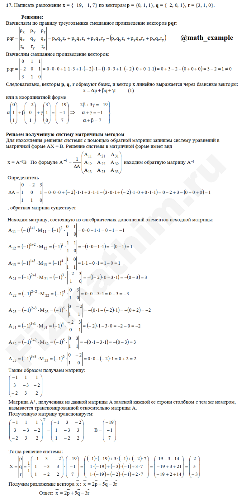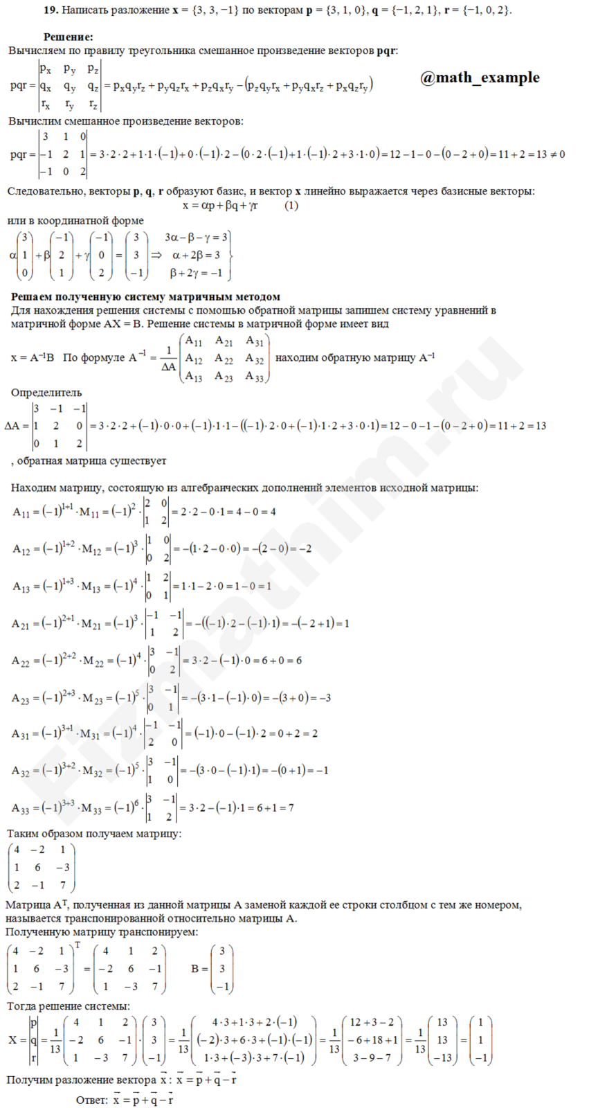 Написать разложение x = {−19, −1, 7} по векторам p = {0, 1, 1}, q = {−2, 0, 1}, r = {3, 1, 0}.