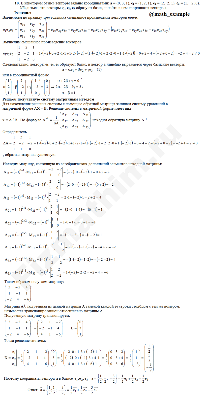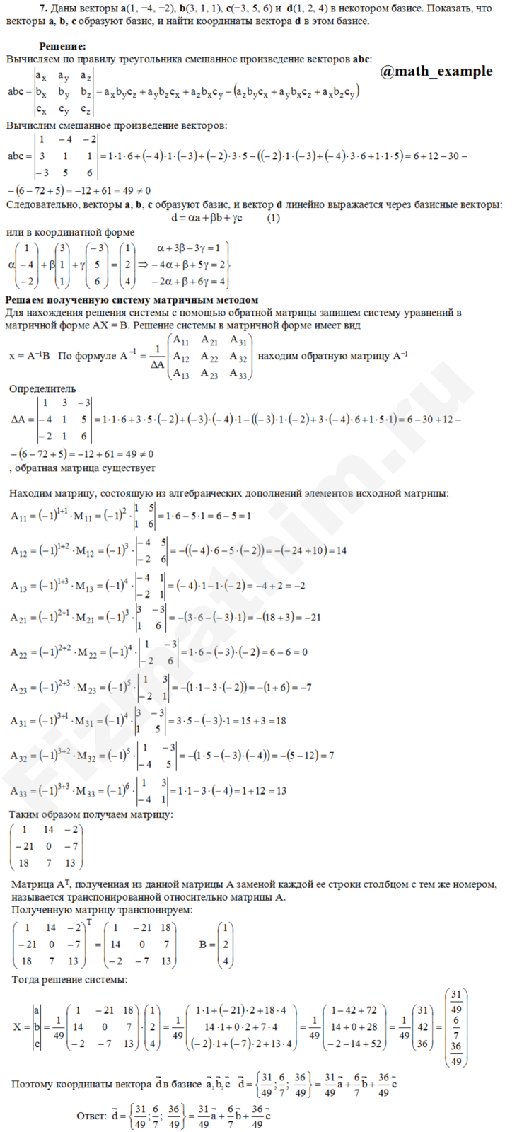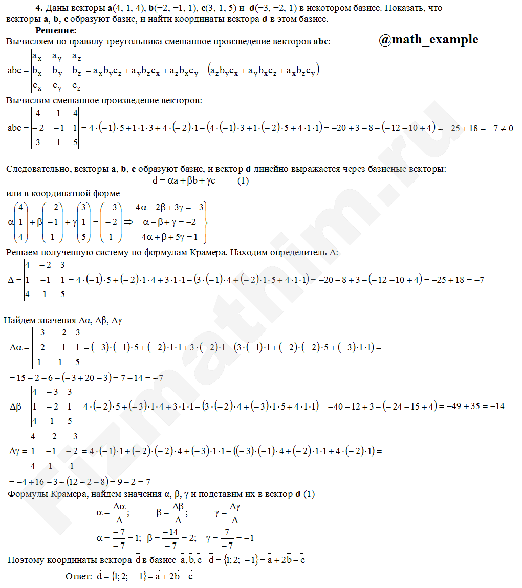 Даны векторы a(4, 1, 4), b(−2, −1, 1), c(3, 1, 5) и d(−3, −2, 1) в некотором базисе. Показать, что векторы а, b, с об...