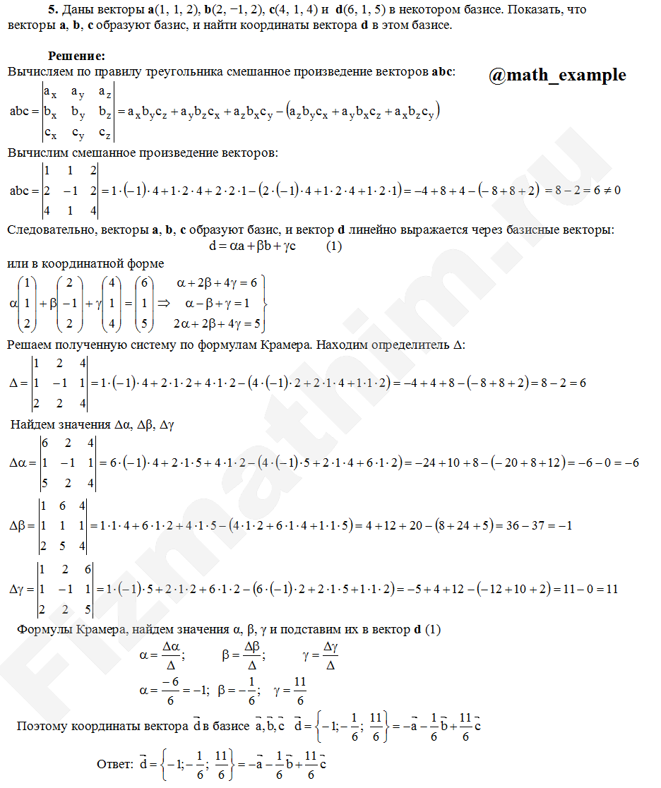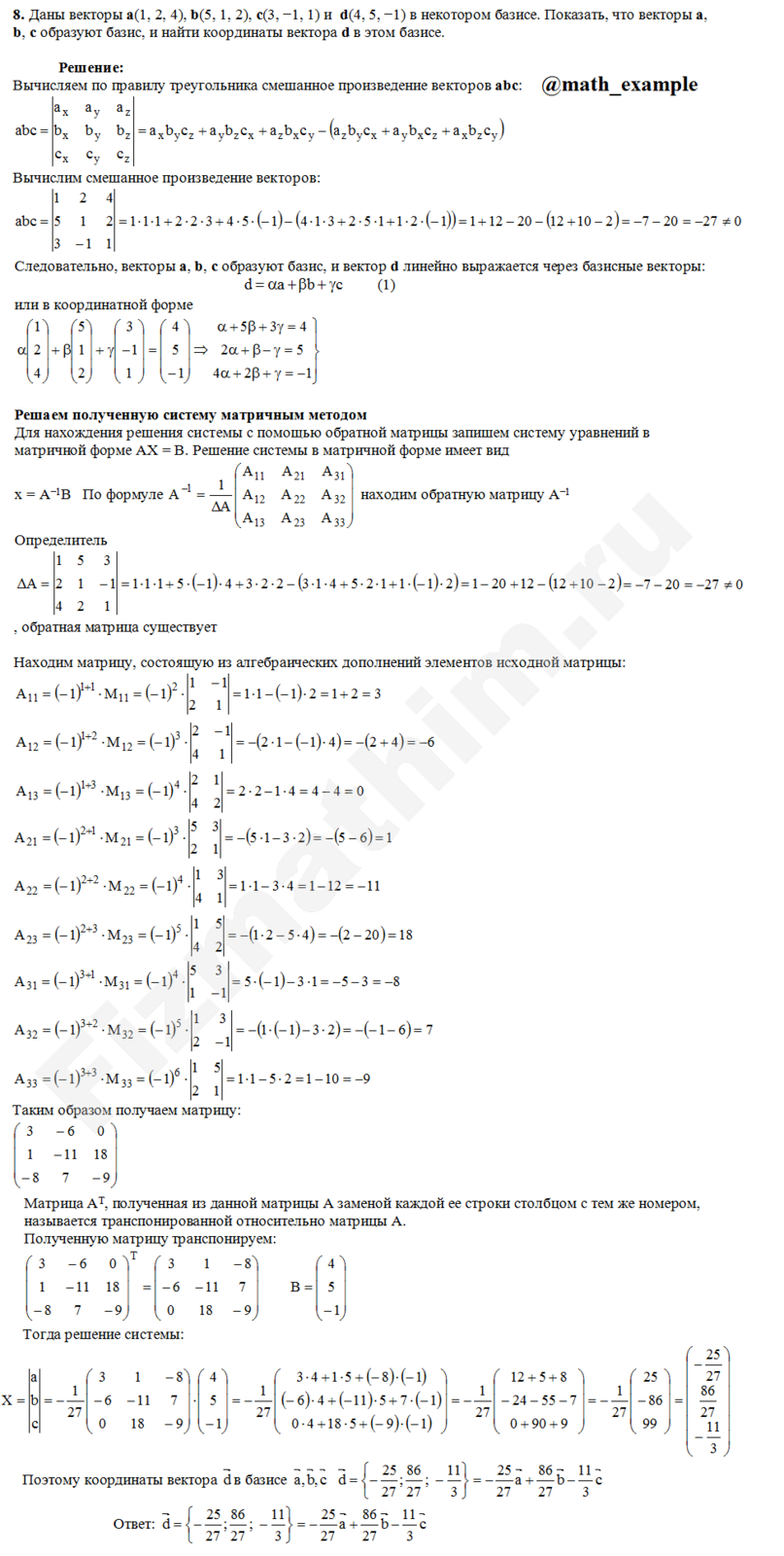 Даны векторы a(1, 2, 4), b(5, 1, 2), c(3, −1, 1) и d(4, 5, −1) в некотором базисе. Показать, что векторы а, b, с обра...