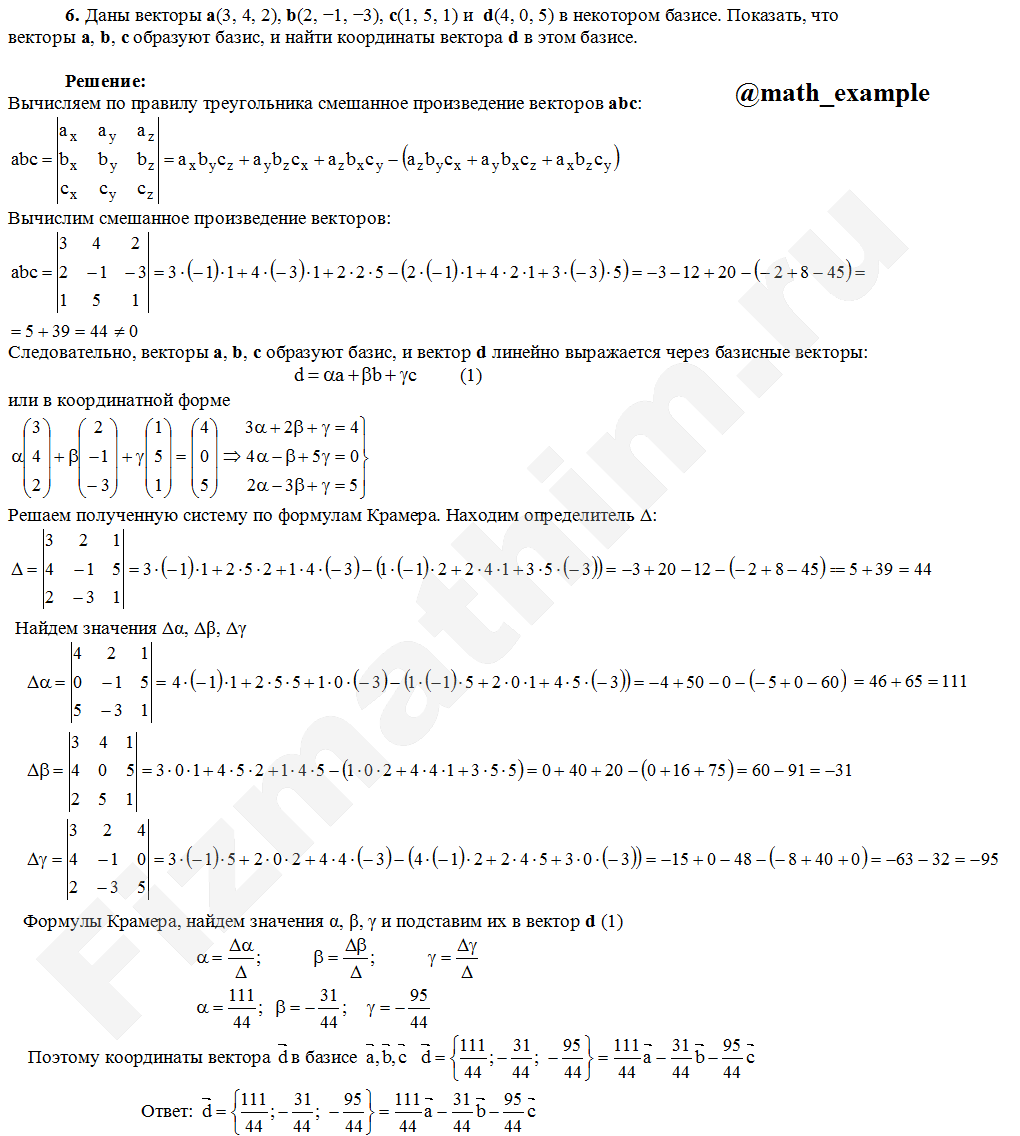 Даны векторы a(3, 4, 2), b(2, −1, −3), c(1, 5, 1) и d(4, 0, 5) в некотором базисе. Показать, что векторы а, b, с обра...