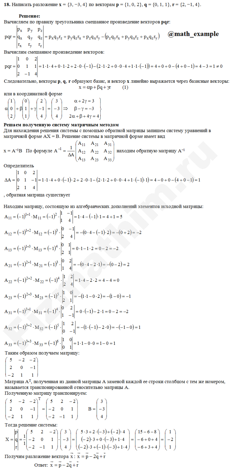 Написать разложение x = {3, −3, 4} по векторам p = {1, 0, 2}, q = {0, 1, 1}, r = {2, −1, 4}.