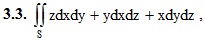 15. Элементы теории поля. 15.1 Векторная функция скалярного аргумента. Производная по направлению и градиент. 15.2 Скалярные и векторные поля 15.3 Поверхностные интегралы 15.4 Поток векторного поля через поверхность. Дивергенция векторного поля. ИДЗ 15.1 Вариант 3. Решебник Рябушко Часть 3 1. Дана функция u(M) = u(x, y, z) и точки M1, M2. Вычислить: 1) производную этой функции в точке M1 по направлению вектора M1M2; 2) grad u(M1) 1.3. u(M) = ln(x2 + y2 + z2), M1(−1, 2, 1), M2(3, 1, −1) 2. Вычислить поверхностный интеграл первого рода по поверхности S, где S – часть плоскости (p), отсеченная координатными плоскостями. (p): 3x + 3y + z = 3 3. Вычислить поверхностный интеграл второго рода. где S – внешняя сторона поверхности куба, ограниченного плоскостями x = 0, y = 0, z = 0, x = 1, y = 1, z = 1 4. Вычислить поток векторного поля a(M) через внешнюю поверхность пирамиды, образуемую плоскостью (p) и координатными плоскостями, двумя способами: а) использовав определение потока; б) с помощью формулы Остроградского – Гаусса. 4.3. а(M) = xi + (x + z)j + (y + z)k, (p): 3x + 3y + z = 3 Подробное решение. Оформлено в Microsoft Word 2003 (Задание решено с использованием редактора формул) Решение задачи добавил: Massimo, Среда, 07.09.2016