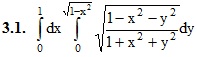 13. Кратные интегралы. 13.1 Двойные интегралы и их вычисление. 13.2 Замена переменных в двойном интеграле. Двойные интегралы в полярных координатах. 13.3 Приложения двойных интегралов. ИДЗ 13.1 Вариант 1. Решебник Рябушко Часть 3 1. Представить двойной интеграл в виде повторного интеграла с внешним интегрированием по х и внешним интегрированием по y, если область D задана указанными линиями. 1.1. D: y = √4 − x2, y = √3x, x ≥ 0 2. Вычислить двойной интеграл по области D, ограниченной указанными линиями. D: y = x2, x = y2 3. Вычислить двойной интеграл, используя полярные координаты. 4. Вычислить площадь плоской области D, ограниченной заданными линями. 4.1. D: y2 = 4x, x + y = 3, y ≥ 0 5. С помощью двойных интегралов вычислить в полярных координатах площадь плоской фигуры, ограниченной указанными линиями. 5.1. (x2 + y2)2 = a2 (4x2 + y2) 6. Вычислить объем тела, ограниченного заданными поверхностями. 6.1. z = x2 + y2, x + y = 1, x ≥ 0, y ≥ 0, z ≥ 0 Подробное решение. Оформлено в Microsoft Word 2003 (Задание решено с использованием редактора формул) Решение задачи добавил: Massimo, Пятница, 28.10.2016