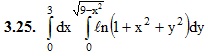 13. Кратные интегралы. 13.1 Двойные интегралы и их вычисление. 13.2 Замена переменных в двойном интеграле. Двойные интегралы в полярных координатах. 13.3 Приложения двойных интегралов. ИДЗ 13.1 Вариант 25. Решебник Рябушко Часть 3 1. Представить двойной интеграл в виде повторного интеграла с внешним интегрированием по х и внешним интегрированием по y, если область D задана указанными линиями. 1.25. D: x = 0, y = 0, y = 1, (x – 3)2 + y2 = 1 2. Вычислить двойной интеграл по области D, ограниченной указанными линиями. D: x + y = 1, y = x2 – 1, x ≥ 0 3. Вычислить двойной интеграл, используя полярные координаты. 4. Вычислить площадь плоской области D, ограниченной заданными линями. 4.25. D: x = y2, x = √2 − y2 5. С помощью двойных интегралов вычислить в полярных координатах площадь плоской фигуры, ограниченной указанными линиями. 5.25. ρ = acos5φ 6. Вычислить объем тела, ограниченного заданными поверхностями. 6.25. x2 + y2 = 1, z = 2 – x2 – y2, z ≥ 0 Подробное решение. Оформлено в Microsoft Word 2003 (Задание решено с использованием редактора формул) Решение задачи добавил: Massimo, Суббота, 05.11.2016