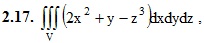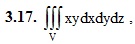 13. Кратные интегралы. 13.4 Тройной интеграл и его вычисление 13.5 Приложения тройных интегралов ИДЗ 13.2 Вариант 17. Решебник Рябушко Часть 3 1. Расставить пределы интегрирования в тройном интеграле если область V ограничена указанными поверхностями. Начертить область интегрирования 1.17. V: x = 1, y = 2x, y = 3x, z ≥ 0, z = 2x2 + y2 2. Вычислить данные тройные интегралы. V: 0 ≤ x ≤ 1, −2 ≤ y ≤ 1, 0 ≤ z ≤ 1 3. Вычислить тройной интеграл с помощью цилиндрических или сферических координат. , υ: 2 ≤ x2 + y2 + z2 ≤ 8, z2 = x2 + y2, x ≥ 0, y ≥ 0, z ≥ 0 4. С помощью тройного интеграла вычислить объем тела, ограниченного указанными поверхностями. Сделать чертеж. 4.17. z ≥ 0, x2 + y2 = 9, z = 5 – x – y Подробное решение. Оформлено в Microsoft Word 2003 (Задание решено с использованием редактора формул) Решение задачи добавил: Massimo, Среда, 16.11.2016