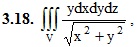 13. Кратные интегралы. 13.4 Тройной интеграл и его вычисление 13.5 Приложения тройных интегралов ИДЗ 13.2 Вариант 18. Решебник Рябушко Часть 3 1. Расставить пределы интегрирования в тройном интеграле если область V ограничена указанными поверхностями. Начертить область интегрирования 1.18. V: y = x, y = –2x, y = 1; z ≥ 0, z = x2 + 4y2 2. Вычислить данные тройные интегралы. V: 0 ≤ x ≤ 2, 1 ≤ y ≤ 2, −1 ≤ z ≤ 0 3. Вычислить тройной интеграл с помощью цилиндрических или сферических координат. , υ: x2 + y2 = 2y, x2 + y2 = 4y, x ≥ 0, z ≥ 0, z = 6 4. С помощью тройного интеграла вычислить объем тела, ограниченного указанными поверхностями. Сделать чертеж. 4.18. z ≥ 0, z = x, x = √4 − y2 Подробное решение. Оформлено в Microsoft Word 2003 (Задание решено с использованием редактора формул) Решение задачи добавил: Massimo, Четверг, 17.11.2016