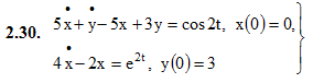 16. Операционное исчисление. 16.2 Нахождение оригиналов по изображениям 16.3 Приложения операционного исчисления ИДЗ 16.2 Вариант 30. Решебник Рябушко Часть 4 1. Решить операторным методом линейное дифференциальное уравнение αẍ + βẋ + γx = f(t), x(t0) = A, ẋ(t0) = B Функцию f(t) и значения коэффициентов α, β, γ, t0, x(t0), ẋ(t0) взять из табл. 16.4 1.30. α = 1, β = −4, γ = 5, f(t) = e2tcost, t0 = π/2, x(t0) = −1, ẋ(t0) = 1 1.30. ẍ − 4ẋ + 5x = e2tcost, x(π/2) = −1, ẋ(π/2) = 1 2. Решить операторным методом систему линейных дифференциальных уравнений Функции f1(t), f2(t) и значения ak, bk, ck, dk (k=1, 2), A, B, x(0), y(0) взять из табл. 16.5 2.30. a1 = 5, b1 = 1, c1 = −5, d1 = 3, f1(t) = cos2t, a2 = 4, b2 = 0, c2 = −2, d2 = 0, f2(t) = e2t, x(0) = 0, y(0)=3 Подробное решение. Оформлено в Microsoft Word 2003 (Задание решено с использованием редактора формул) Решение задачи добавил: Massimo, Понедельник, 21.11.2022