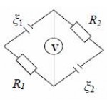 В схеме к задаче 47 R1=R2=100 Ом Вольтметр показывает 50 В сопротивление вольтметра равно 150 Ом Найти ЭДС батарей Сопротивлением источников пренебречь