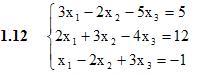 ИДЗ 1.2 Вариант 12. Решения Рябушко Сборник задач №11. Проверить совместность системы уравнений и в случае совместности решить ее: а) по формулам Крамера; б) с помощью обратной матрицы (матричным методом); в) методом Гаусса. 2. Проверить совместность системы уравнений и в случае совместности решить ее: а) по формулам Крамера; б) с помощью обратной матрицы (матричным методом); в) методом Гаусса. 3. Решить однородную систему линейных алгебраических уравнений. 4. Решить однородную систему линейных алгебраических уравнений. Подробное решение. Оформлено в Microsoft Word 2003 Решение задачи добавил: Massimo, Воскресенье, 16.06.2013