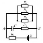 Раздел: Электростатика. Электричество и постоянный ток. Условие задачи: Определите разность потенциалов на обкладках конденсатора в схеме, приведенной на рисунке. ЭДС источника ε = 20 В, сопротивления всех резисторов равны. Внутренним сопротивлением источника пренебречь. Подробное решение. Оформлено в Microsoft Word 2003. (Задание решено с использованием редактора формул) Решение задачи добавил: Massimo, Пятница, 08.08.2014