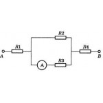 Найти силу токов и напряжения в цепи (рис.) если амперметр показывает 2 А а сопротивление резисторов R1 = 2 Ом R2 = 10 Ом R3 = 15 Ом R4 = 4 Ом