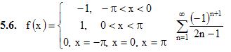 12. Ряды 12.5 Ряды Фурье ИДЗ 12.3 Вариант 6. Решебник Рябушко Часть 3 1. Разложить в ряд Фурье периодическую (с периодом ω=2π) функцию f(x) заданную на отрезке [-π; π] 2. Разложить в ряд Фурье функцию f(x), заданную в интервале (0; π) продолжив (доопределив) ее четным и нечетным образом. Построить графики для каждого продолжения. 2.6. f(x) = (x – 1)2 3. Разложить в ряд Фурье в указанном интервале периодическую функцию f(x) с периодом w=2l 3.6. f(x) = x, 1 < x < 3, l = 1 4. Разложить в ряд Фурье функцию, заданную графически. 5. Воспользовавшись разложением функции f(x) в ряд Фурье в указанном интервале, найти сумму данного числового ряда. Подробное решение. Оформлено в Microsoft Word 2003 (Задание решено с использованием редактора формул) Решение задачи добавил: Massimo, Четверг, 25.09.2014