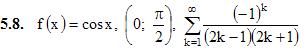 12. Ряды 12.5 Ряды Фурье ИДЗ 12.3 Вариант 8. Решебник Рябушко Часть 3 1. Разложить в ряд Фурье периодическую (с периодом ω=2π) функцию f(x) заданную на отрезке [-π; π] 2. Разложить в ряд Фурье функцию f(x), заданную в интервале (0; π) продолжив (доопределив) ее четным и нечетным образом. Построить графики для каждого продолжения. 2.8. f(x) = sh2x 3. Разложить в ряд Фурье в указанном интервале периодическую функцию f(x) с периодом w=2l 3.8. f(x) = 10 – x, 5 < x < 15, l = 5 4. Разложить в ряд Фурье функцию, заданную графически. 5. Воспользовавшись разложением функции f(x) в ряд Фурье в указанном интервале, найти сумму данного числового ряда. Подробное решение. Оформлено в Microsoft Word 2003 (Задание решено с использованием редактора формул) Решение задачи добавил: Massimo, Четверг, 25.09.2014