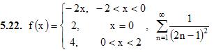 12. Ряды 12.5 Ряды Фурье ИДЗ 12.3 Вариант 22. Решебник Рябушко Часть 3 1. Разложить в ряд Фурье периодическую (с периодом ω=2π) функцию f(x) заданную на отрезке [-π; π] 2. Разложить в ряд Фурье функцию f(x), заданную в интервале (0; π) продолжив (доопределив) ее четным и нечетным образом. Построить графики для каждого продолжения. 2.22. f(x) = x2 + 1 3. Разложить в ряд Фурье в указанном интервале периодическую функцию f(x) с периодом w=2l 3.22. f(x) = 2x + 2, −2 < x < 2, l = 2 4. Разложить в ряд Фурье функцию, заданную графически. 5. Воспользовавшись разложением функции f(x) в ряд Фурье в указанном интервале, найти сумму данного числового ряда. Подробное решение. Оформлено в Microsoft Word 2003 (Задание решено с использованием редактора формул) Решение задачи добавил: Massimo, Четверг, 25.09.2014