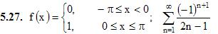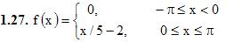 12. Ряды 12.5 Ряды Фурье ИДЗ 12.3 Вариант 27. Решебник Рябушко Часть 3 1. Разложить в ряд Фурье периодическую (с периодом ω=2π) функцию f(x) заданную на отрезке [-π; π] 2. Разложить в ряд Фурье функцию f(x), заданную в интервале (0; π) продолжив (доопределив) ее четным и нечетным образом. Построить графики для каждого продолжения. 2.27. f(x) = 10−x 3. Разложить в ряд Фурье в указанном интервале периодическую функцию f(x) с периодом w=2l 4. Разложить в ряд Фурье функцию, заданную графически. 5. Воспользовавшись разложением функции f(x) в ряд Фурье в указанном интервале, найти сумму данного числового ряда. Подробное решение. Оформлено в Microsoft Word 2003 (Задание решено с использованием редактора формул) Решение задачи добавил: Massimo, Четверг, 25.09.2014