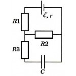 Конденсатор ёмкостью 2 мкФ включён в цепь (рис.) содержащую три резистора и источник постоянного тока с ЭДС 3,6 В и внутренним сопротивлением 1 Ом Сопротивления резисторов R1 = 4 Ом R2 = 7 Ом R3